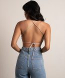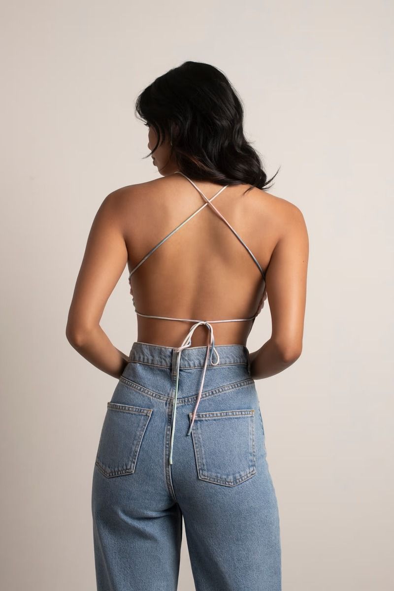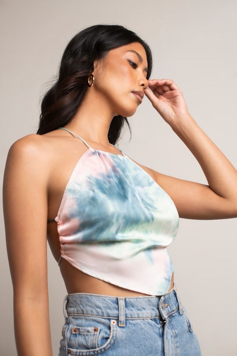 Stay cool on vacation with the Ersa Crop Top in Mint Blue Multi. This backless scarf top boasts soft hues of blue that can help you unwind. Pair with denim jeans or a light wrap skirt for a simple yet stylish casual outfit.
